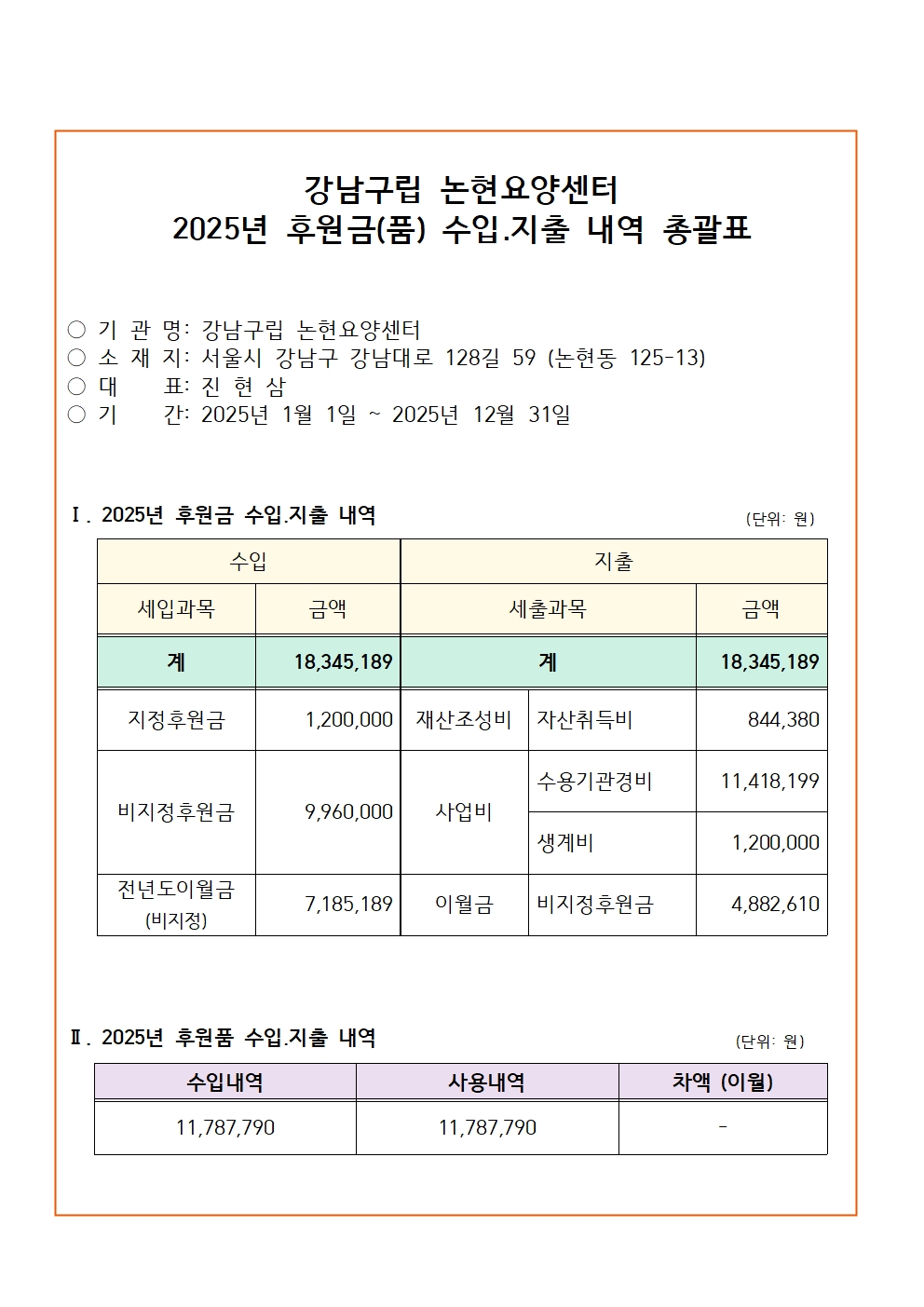 2025년 후원금(품) 수입사용 총괄표작성일 : 2026-01-132025년 후원금(품) 수입사용 총괄표